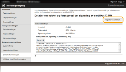 Du kan ikke bruke nøkkelparet generert av CSR (Certificate Signing Request) inntil sertifikatet er registrert. Straks sertifikatmyndigheten har utstedt det digitale seritifikatet, registrerer du det med fremgangsmåten under.