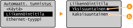 valitse <Yksisuuntainen> tai <Kaksisuuntainen> .![]() <Yksisuuntainen>Tietoja lähetetään ja vastaanotetaan vuorotellen. Valitse tämä, kun laite on yhdistetty verkkoon yksisuuntaisessa tilassa.