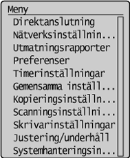 visas skärmen <Meny>. På den här skärmen kan du ange allmänna enhetsinställningar som <Preferenser> och <Timerinställningar>, men även många inställningar för respektive funktion, till exempel kopiera och skanna.