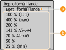 Du kan förstora eller förminska kopior genom att använda ett förinställt reproförhållande, till exempel <A5->A4>, eller genom att ställa in en anpassat reproförhållande i steg om 1 %.