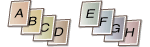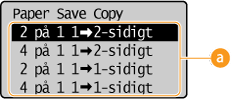 Du kan använda <2 på 1>/<4 på 1> för att kopiera flera dokument på ett enstaka ark och <2-sidig> för att kopiera dokumentet på båda sidor av ett ark. Om du använder