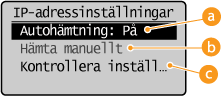 ![]() Om <På> visas trycker du på <Autohämtning> och ställer in både <Välj protokoll> och <Auto-IP> på <Av>.