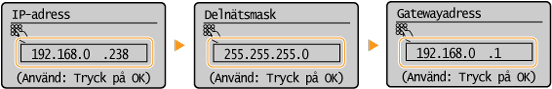 <Delnätsmask> <Gatewayadress>.Ange varje inställning med sifferknapparna och tryck på