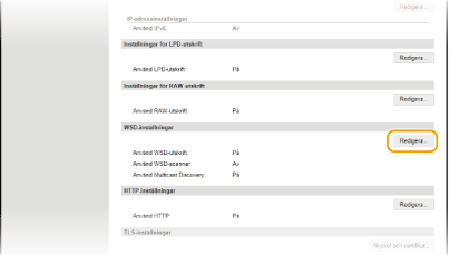 Markera kryssrutan om du vill hämta information om enheten från en dator via WSD. Kryssrutan markeras automatiskt när kryssrutan [Använd WSD-utskrift] är markerad. [Använd WSD-scanner]