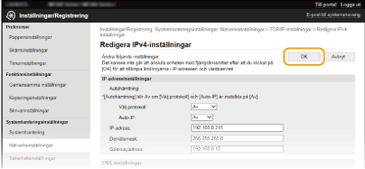Använda kontrollpanelenDNS-inställningar kan också hämtas med skärmen <Meny>. IPv4-inställningar IPv6-inställningar