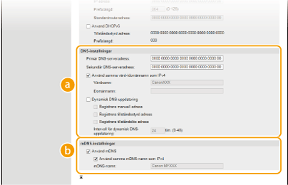 Markera kryssrutan för att dynamiskt uppdatera DNS-posterna när enhetens IP-adress ändras. Om du vill ange de typer av adresser som ska registreras för DNS-servern markerar du kryssrutan för [Registrera manuell adress], [Registrera tillståndsstyrd adress] eller [Registrera tillståndslös adress]. Om du vill ange ett intervall mellan uppdateringar anger du tiden i timmar i textrutan [Intervall för dynamisk DNS-uppdatering]. [mDNS-inställningar][Använd mDNS]