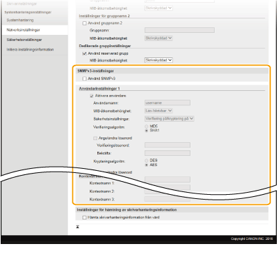 SNMP (Simple Network Management Protocol) är ett protokoll som används för att övervaka och styra kommunikationsenheter i ett nätverk med hjälp av MIB (Management Information Base). Enheten har stöd för SNMPv1 och säkerhetsutökad SNMPv3. Du kan kontrollera enhetens status från en dator när du skriver ut dokument eller använder Fjärranvändargränssnittet. Du kan aktivera antingen SNMPv1 eller SNMPv3 eller båda samtidigt. Ange de inställningar för varje version som passar din nätverksmiljö och syftet med användningen.