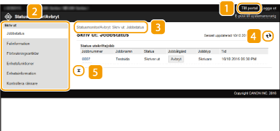 Visar status för aktuella utskriftsdokument samt historik över utskrift och kopiering. Du kan även kontrollera enhetens status.