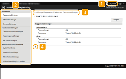 Visar sidan [Inställningar/Registrering]. När du har loggat in i systemhanteringsläge kan du ändra inställningarna och spara/läsa in registrerade data.