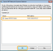 Kontrollera att enheten och datorn är anslutna och att alla program har installerats. För hur du kontrollerar enheten, läs "MF-drivrutin installationsguide". Om du vill ansluta via trådlöst eller trådbundet nätverk måste du registrera enheten i Välj MF Nätverksscanner. Följ i så fall proceduren nedan. Proceduren krävs inte om enheten och datorn är anslutna via USB.
