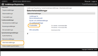 Om IP-adresser anges felaktigt kanske du inte kan använda enheten från Fjärranvändargränssnittet och då måste du ställa in <IPv4-adressfilter> eller <IPv6-adressfilter> på <Av>. IPv4-adressfilter IPv6-adressfilter