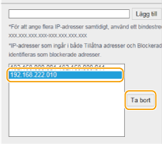 Ta bort en IP-adress från undantag Välj en IP-adress och klicka på [Ta bort].
