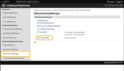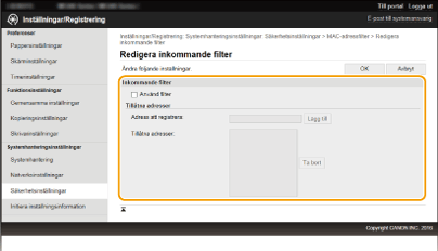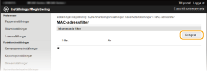 ![]() Söka efter inmatningsfel Om MAC-adresser anges felaktigt kanske du inte kan använda enheten från Fjärranvändargränssnittet och då måste du ställa in <MAC-adressfilter> på <Av>. MAC-adressfilter