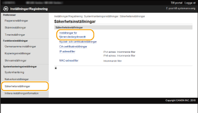 Starta fjärranvändargränssnittet med TLSOm du försöker starta Fjärranvändargränssnittet när TLS har aktiverats, kanske en säkerhetsvarning visas gällande säkerhetscertifikatet. I så fall kontrollerar du att rätt webbadress har angetts i adressfältet och sedan går du vidare och visar Fjärranvändargränssnittsskärmen. Starta Fjärranvändargränssnittet