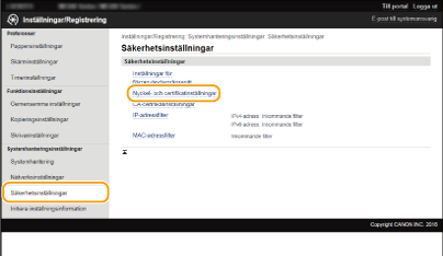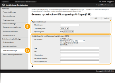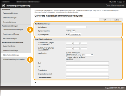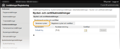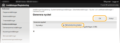 Ett nyckelpar kan genereras med enheten när det krävs för krypterad kommunikation via TLS (Transport Layer Security). Du kan använda TLS när du använder enheten via Fjärranvändargränssnittet. Upp till fem nyckelpar (inklusive de förinstallerade paren) kan registreras för enheten Självsignerade certifikat används med nyckelpar som skapas i "Nätverkskommunikation". Med "Nyckel och certifikatsigneringsförfrågan (CSR)" kan du ansöka om ett digitalt CA-certifikat för nyckelparet som genereras av maskinen.