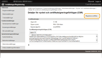 Du kan inte använda nyckelparet som skapas med Certificate Signing Request (CSR) innan certifikatet har registrerats. När den certifierande myndigheten har gett dig ett digitalt certifikat registrerar du det enligt stegen nedan.