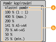 Kopie lze zvětšit nebo zmenšit pomocí předvolených poměrů kopírování, například <A5->A4>, případně nastavením vlastního poměru kopírování v krocích po 1 %.
