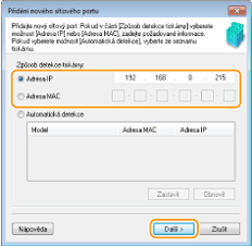 ![]() ![]() Pokud není zařízení detekováno Klikněte na tlačítko [Aktualizovat]. Jestliže problém přetrvává, klikněte na [IP adresa] nebo [Adresa MAC], zadejte IP adresu nebo adresu MAC zařízení (Zobrazení nastavení sítě) a poté klikněte na [Další].