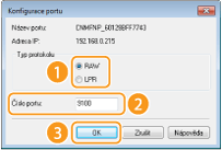 V nabídce [Typ protokolu] vyberte přepínač [LPR] nebo [RAW], podle potřeby změňte číslo v okně [Číslo portu] a poté klikněte na tlačítko [OK].