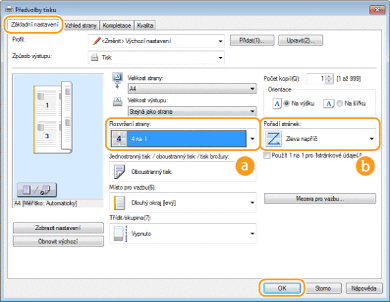 Můžete tisknout více stránek na jeden list. Pomocí možnosti [4 na 1] nebo [9 na 1] můžete například vytisknout čtyři nebo devět stránek na jeden list. Tuto funkci použijte, pokud chcete šetřit papírem nebo si dokument prohlédnout ve formě miniatur.