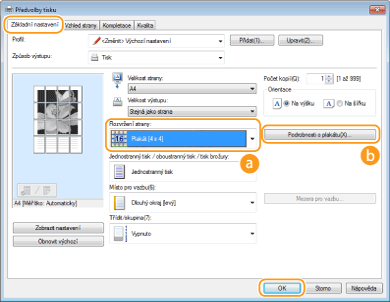 Nastavení velikosti plakát nelze vybrat, pokud je povolen oboustranný tisk. Vyberte možnost [Jednostranný tisk] v nabídce [Jednostranný tisk / oboustranný tisk / tisk brožury] a poté vyberte nastavení velikosti plakátu.