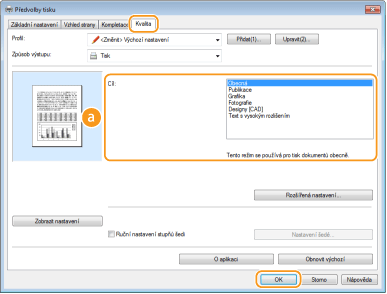 Vyberte možnost odpovídající typu dokumentu a účelu tisku. V případě obecného použití vyberte možnost [Obecná], případně chcete-li tisknout fotografické obrázky v optimální kvalitě, vyberte možnost [Fotografie].