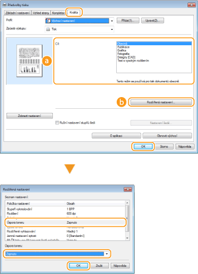Na obrazovce [Rozšířená nastavení] lze kromě nastavení úspory toneru zadat různá nastavení tisku. Další informace získáte kliknutím na možnost [Nápověda] na obrazovce ovladače tiskárny.