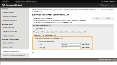 Zaškrtněte políčko [Použít přístupový PIN vzdáleného UR] a nastavte kód PIN.