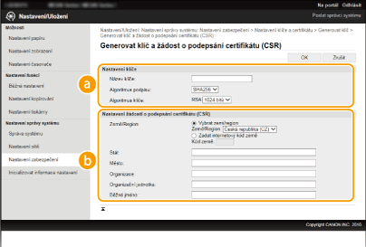 Pokud šifrovaná komunikace vedená prostřednictvím protokolu TLS (Transport Layer Security) vyžaduje pár klíčů, je možné ho pomocí zařízení vygenerovat. K přístupu k zařízení přes Vzdálené uživatelské rozhraní lze použít funkci TLS. Pro zařízení je možné vygenerovat až pět párů klíčů (včetně předinstalovaných párů). Certifikáty podepsané svým držitelem jsou používány s páry klíčů vygenerovanými pomocí možnosti „Komunikace v síti“. Pomocí možnosti „Klíč a žádost o podepsání certifikátu (CSR)“ můžete požádat o digitální certifikát od certifikační autority pro pár klíčů vygenerovaný zařízením.
