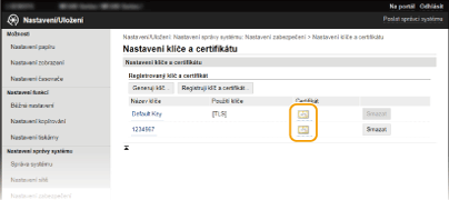 Kliknutím na možnost [Nastavení klíče a certifikátu] ověřte pár klíčů. Kliknutím na možnost [Nastavení certifikátu CA] ověřte certifikát CA.