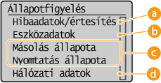 gomb megnyomásakor megjelenő képernyőn ellenőrizheti az éppen nyomtatott vagy másolt dokumentumok állapotát, valamint a készülék állapotát, például a hátralévő festékszinteket stb., vagy a hálózati beállításokra, például a készülék IP-címére vonatkozó információkat.