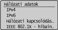 Hálózati beállításokat, például a készülék IP-címét, valamint állapotokat, például a vezeték nélküli helyi hálózati kommunikáció állapotát jeleníti meg.