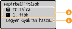 (Papírbeállítás) gombot, akkor megjelenik a <Papírbeállítások> képernyő. Válassza ki a papírt a képernyőn. Szintén ezzel a gombbal módosíthatja a papírbeállításokat, ha olyan méretű papírt helyez be, amely eltér a korábban behelyezett papírmérettől. Ne feledje, hogy a papír megfelelő adagolásához meg kell adni a helyes papírbeállításokat.