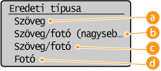 Kiválaszthatja a másolás optikai képminőségét a dokumentum típusa – például csak szöveges dokumentum, diagramokat és ábrákat tartalmazó dokumentum vagy újságfényképek – szerint.
