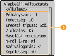 gomb megnyomásakor megjelennek. Ha ezeket az alapértelmezett beállításokat a gyakran használt műveleteknek megfelelően módosítja, azzal kiküszöbölheti az állandó beállítások konfigurálásához szükséges időt az egyes másolásoknál.
