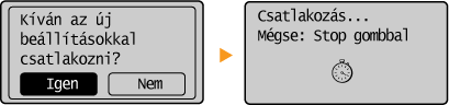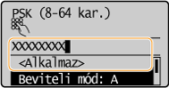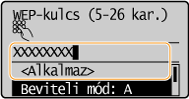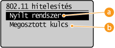 ![]() Ha a <Nyílt rendszer> lehetőséget választja Ha a készülék vezeték nélküli hálózathoz csatlakozik, és a vezeték nélküli útválasztón megosztott kulcsos hitelesítés van beállítva, akkor a készülék hitelesítési hibát észlel. Ilyenkor a készülék automatikusan a <Megosztott kulcs> beállításra vált, és ismét megpróbálkozik a csatlakozással. |