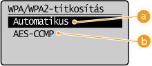 gombot.![]() <Automatikus>Úgy állítja be a készüléket, hogy az a vezeték nélküli útválasztó beállításának megfelelően automatikusan választ az AES-CCMP és a TKIP mód közül.