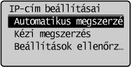 gombot.![]() ![]() Ha nem DHCP/BOOTP/RARP protokollal kívánja kiosztani az IP-címeket Válassza a <Ki> lehetőséget. Ha a <DHCP>, <BOOTP>, vagy <RARP> lehetőséget választja, de a megfelelő szolgáltatás nem érhető el, akkor a készülék fölöslegesen fordít időt és kommunikációs erőforrásokat az adott szolgáltatás hálózaton történő keresésére. |