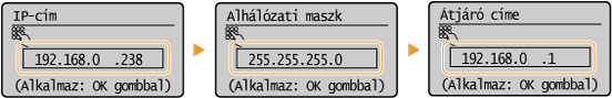 <Alhálózati maszk> <Átjáró címe>.Adja meg mindegyik beállítást a számgombokkal, és nyomja meg mindegyik képernyőn az