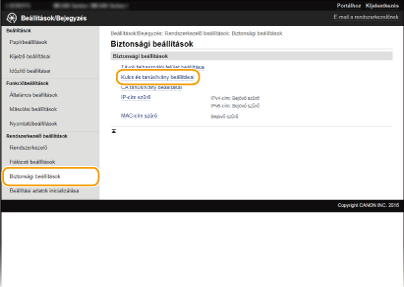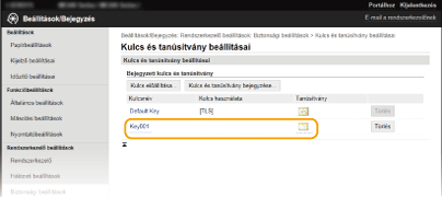 Ha egy kulcspárt használja valamilyen funkció, például a „[TLS]” vagy az „[IEEE 802.1X]” látható a [Kulcs használata] mezőben, akkor nem törölhető. Ebben az esetben a kulcspár törlése előtt ki kell kapcsolni a funkciót, vagy le kell cserélnie a kulcspárt.