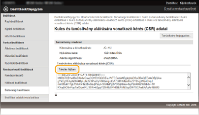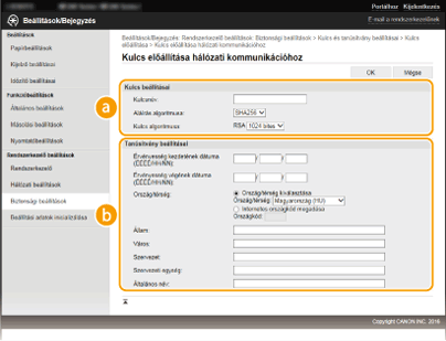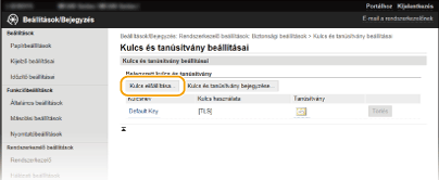 Ha a TLS (Transport Layer Security) megoldáson keresztül folytatott titkosított kommunikációhoz kulcspárra van szükség, akkor az előállítható a készülékkel. A TLS protokollt a készülék Távoli felhasználói felületen keresztüli elérésekor használhatja. A készülékhez legfeljebb öt kulcspár generálható (beleértve az előre telepített párokat is). Az önaláírt tanúsítványok a „Hálózati kommunikáció” részben generált kulcspárokkal használatosak. A „Kulcs és tanúsítvány aláírására vonatkozó kérés (CSR)” segítségével a Hitelesítésszolgáltató által kiadott digitális tanúsítványt kérhet a készülék által generált kulcspárhoz.