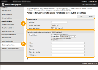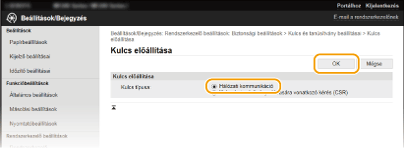 Válassza a [Kulcs és tanúsítvány aláírására vonatkozó kérés (CSR)] lehetőséget, és kattintson az [OK] gombra.