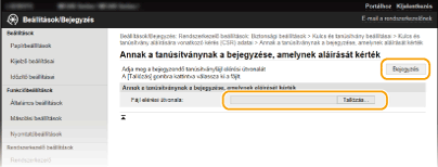Kattintson a [Tallózás] elemre, adja meg a fájlt a tanúsítvány-aláírási kérelemhez, majd kattintson a [Bejegyzés] gombra.