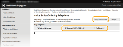 A készülékkel használni kívánt kulcspárok és digitális tanúsítványok hitelesítésszolgáltatóktól szerezhetők be. A fájlokat mentheti a számítógépre, majd bejegyezheti a Távoli felhasználói felülettel. Győződjön meg róla, hogy a kulcspár és a tanúsítvány megfelel a készülék által támasztott követelményeknek (