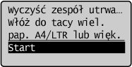 Do modułów utrwalania wewnątrz urządzenia mogą przylegać zanieczyszczenia, powodując powstawanie czarnych smug na wydrukach. Czyszczenie modułu utrwalania należy wykonywać zgodnie z poniższą procedurą. Nie można przeprowadzić czyszczenia modułu utrwalania, jeżeli w urządzeniu znajdują się dokumenty oczekujące na wydruk. Do czyszczenia modułu utrwalającego potrzebny jest papier większego formatu niż A4 lub Letter. Przed przystąpieniem do poniższej procedury papier należy umieścić w otworze podawania ręcznego.