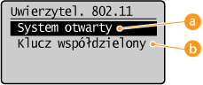 ![]() Jeśli wybrano opcję <System otwarty> Jeśli dla routera bezprzewodowego skonfigurowano uwierzytelnianie za pomocą klucza wspólnego, podczas nawiązywania połączenia z bezprzewodową siecią LAN występuje błąd uwierzytelniania. Jeśli tak się stanie, urządzenie automatycznie zmienia odpowiednie ustawienie na <Klucz współdzielony> i ponawia próbę nawiązania połączenia. |