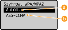 .![]() <Autom.>Konfiguracja urządzenia w taki sposób, aby automatycznie wybierana była metoda szyfrowania AES-CCMP lub TKIP, zgodnie z ustawieniem routera bezprzewodowego.