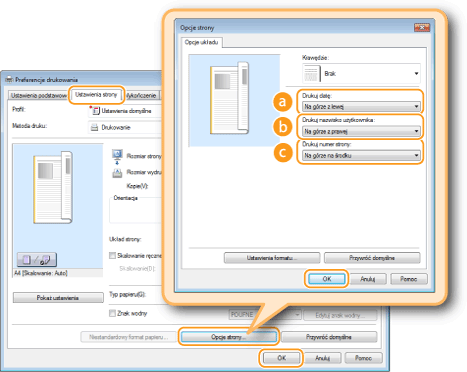Wybierz miejsce, w którym ma zostać umieszczona data wydruku, nazwa użytkownika lub numer strony