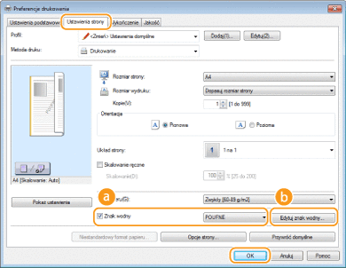 Na dokumencie mogą zostać nadrukowane znaki wodne np. „KOPIA” lub „POUFNE”. Można utworzyć nowe znaki wodne lub skorzystać z wcześniej zarejestrowanych.