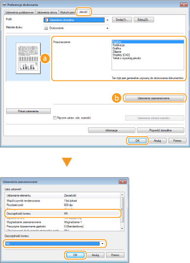 Zakładka [Ustawienia zaawansowane] umożliwia konfigurację różnych ustawień wydruku innych niż funkcja oszczędzania toneru. Aby uzyskać więcej informacji, kliknij pozycję [Pomoc] na ekranie sterownika drukarki.